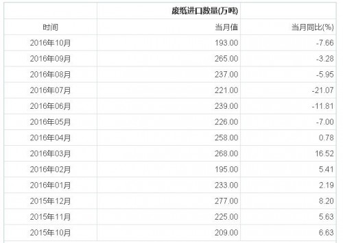 美國、歐盟和日本是中國主要廢紙進口來源國,美歐日等國紙產量長期下行,廢紙資源價值凸顯,主要進口來源國的廢紙進口量均于近年見頂。據數據庫數據顯示,2016年10月我國廢紙進口193萬噸,同比下降7.66%;