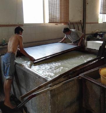 “云英妙制勝南朝,工出西南壯與瑤,助我狂書(shū)三萬(wàn)字,不傷斑管兔千毫。”著名書(shū)法大師啟功先生曾題詩(shī)贊譽(yù)的書(shū)畫(huà)紙,就是由廣西都安書(shū)畫(huà)紙廠生產(chǎn)。在 生產(chǎn)車(chē)間,記者看到,工人正在手工操作制紙。兩名工人用竹簾把紙漿從池中撈起,漏掉的是水,留在簾子上的就是最原始的“紙”了。再將撈出來(lái)的紙進(jìn)行壓干、 烘烤、揭貼、逐張目測(cè)手檢、裁剪、包裝,一刀刀書(shū)畫(huà)紙就做成了。