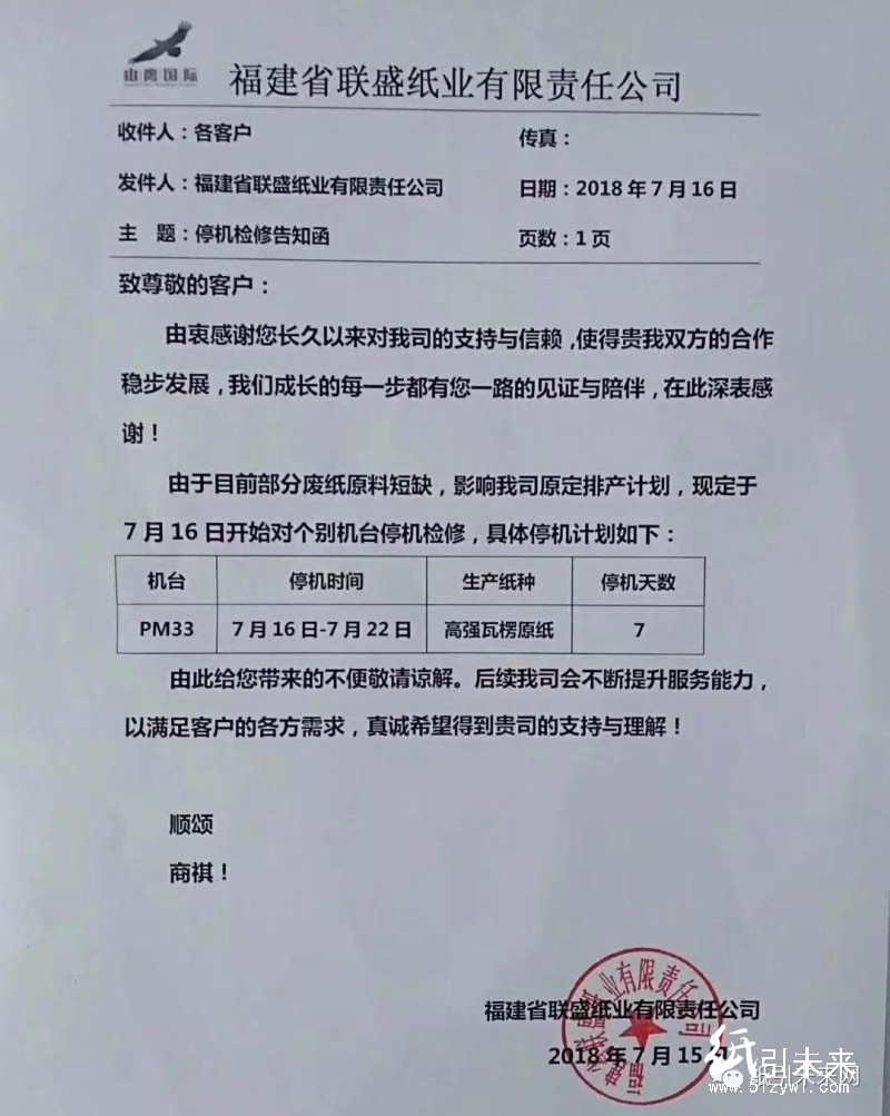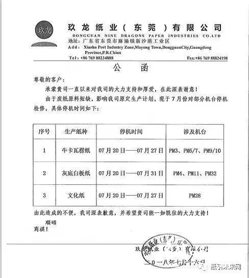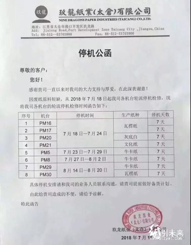 就在外廢大舉獲批同時,東莞玖龍、福建聯盛、太倉玖龍等龍頭紙業陸續發布“停機公函”(見下圖),且大都停機在一周左右,停機清一色的理由是“廢紙原料短缺‘?!常理是,物以稀為貴,既然是廢紙原料短缺,那應該漲價收購才是!