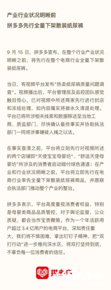 隨后,拼多多宣布,在將先行在整個電商行業全量下架散裝紙尿褲,等待整個行業狀況明晰。并宣布立刻先行對視頻所述的兩個店鋪即“天使寶寶母嬰坊”、“舒適天使母嬰坊”所涉及的消費者啟動賠付綠色通道。