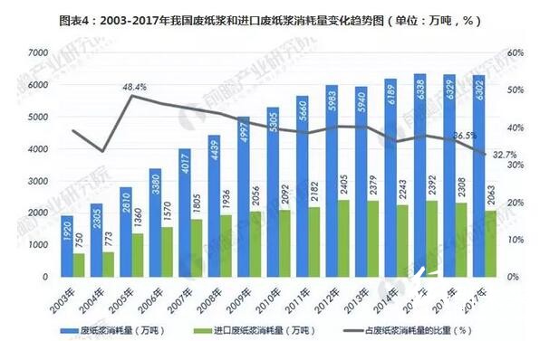從進口廢紙漿占我國廢紙漿消耗量的比重來看,2017年我國廢紙漿消耗量為6302萬噸,其中2063萬噸來自進口廢紙制漿,依存度為32.7%。