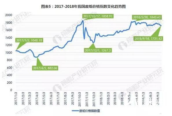 據中國再生資源回收利用協會廢紙分會統計,2017年1月以來我國廢紙價格整體上揚,尤其是在2017年10月份達到了歷史新高1858.91,雖有有所下滑,而2018年以來我國廢紙價格繼續保持上揚,5月28日,廢紙價格達到1840.63,處于較高水平。2018年9月18日我國廢紙價格指數為1721.42。受外廢進口數量和質量限制影響,廢紙市場供給不足將助推廢紙價格持續上揚。廢紙進口限制對于國內廢紙價格的影響仍將持續。