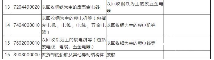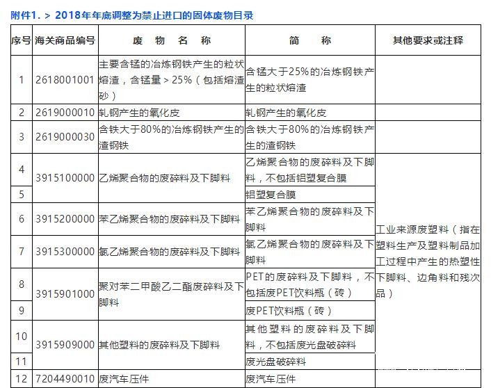 一、將廢五金類、廢船、廢汽車壓件、冶煉渣、工業來源廢塑料等16個品種固體廢物(見附件1),從《限制進口類可用作原料的固體廢物目錄》調入《禁止進口固體廢物目錄》,自2018年12月31日起執行。