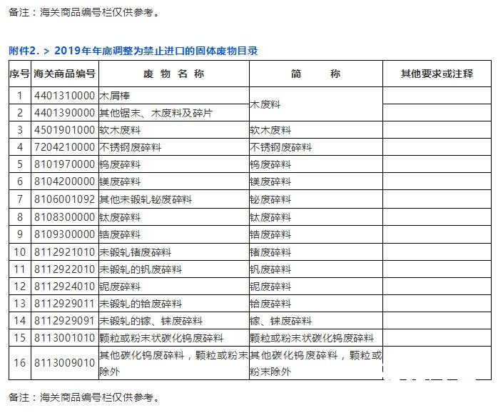 二、將不銹鋼廢碎料、鈦廢碎料、木廢碎料等16個品種固體廢物(見附件2),從《限制進口類可用作原料的固體廢物目錄》《非限制進口類可用作原料的固體廢物目錄》調入《禁止進口固體廢物目錄》,自2019年12月31日起執行。