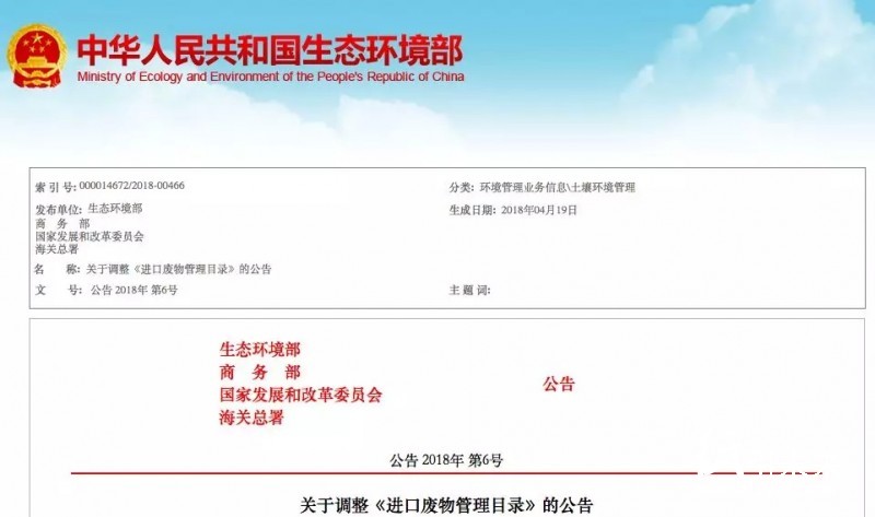 為進一步規范固體廢物進口管理,防治環境污染,根據《中華人民共和國固體廢物污染環境防治法》《固體廢物進口管理辦法》及有關法律法規,生態環境部、商務部、發展改革委、海關總署對現行的《限制進口類可用作原料的固體廢物目錄》《非限制進口類可用作原料的固體廢物目錄》和《禁止進口固體廢物目錄》進行以下調整: