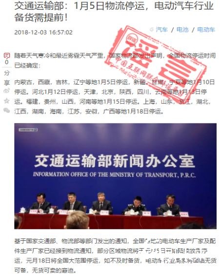 核心提示:近日,一則“全國物流停運”的消息在朋友圈瘋傳。消息以所謂“國家交通部”、“國家物流部”的名義發布通知:“部分區域物流將于元月5日開始陸續放假停運,元月18日將全國大范圍停運,還提出了各省物流停運的具體時間”。