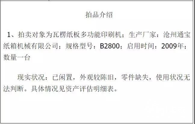 拍賣標的:廣西雙金彩印包裝有限公司2米七層瓦楞紙板生產線一條、1.8米五層紙板生產線1條