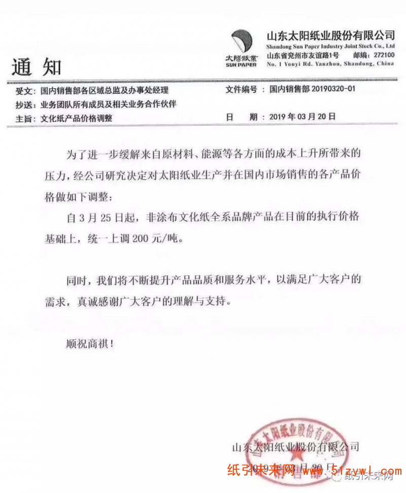 山東泉林集團有限公司:鑒于目前原材物料、能源等各種造紙原輔材料價格不斷上漲,為緩解企業生產運營成本壓力,持續為您提供優質的產品和服務,經公司研究決定,自2019年3月20日起,我公司精制膠版印刷紙上調300元/噸,其它所有品牌文化用紙價格統一上調200元/噸。