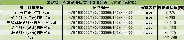 紙引未來網訊 4月23日,固廢中心公布的2019年第6批限制進口許可證顯示,審核通過了山西強偉紙業、沈陽玖龍、福建聯盛(山鷹)、泉州玖龍、龍海聯盛共4家新獲核準總量為22.48萬噸。詳細信息如下: