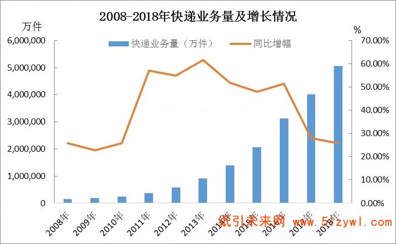 據統計,2018年全國快遞業務量達到5050,000萬件,同比增幅在25.8%,其中消耗包裝箱約143億個,中國快遞業的繁榮,也極大地帶動了紙箱用紙—瓦楞及箱板紙的需求用量。