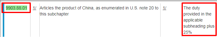 繼續在網頁中查詢“9903.88.01”,這里就明確提及,這一部分的中國產品在適用稅率基礎上再加25%。