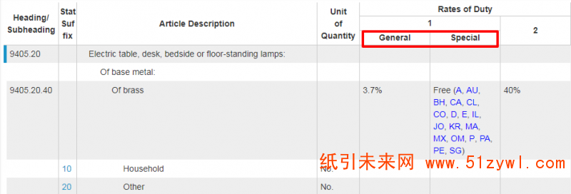 繼續我們在上一步對HTS碼的查詢,針對具體產品,可以看到在“Rates of Duty”處有好幾欄,究竟應該看哪一欄呢?