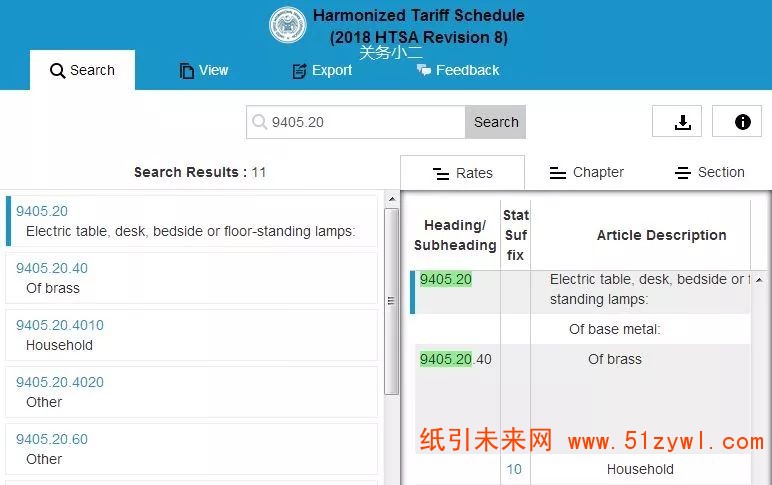 1.查詢HTS CODE:進入上述網站,在Tariff Assistance項下Search the current Harmonized Tariff Schedule...下的搜索框中輸入輸入中國HS CODE的前六位數,如臺燈940520****,搜索結果頁面的左邊框有詳細的HTS CODE,根據自己的產品選擇HTS CODE。