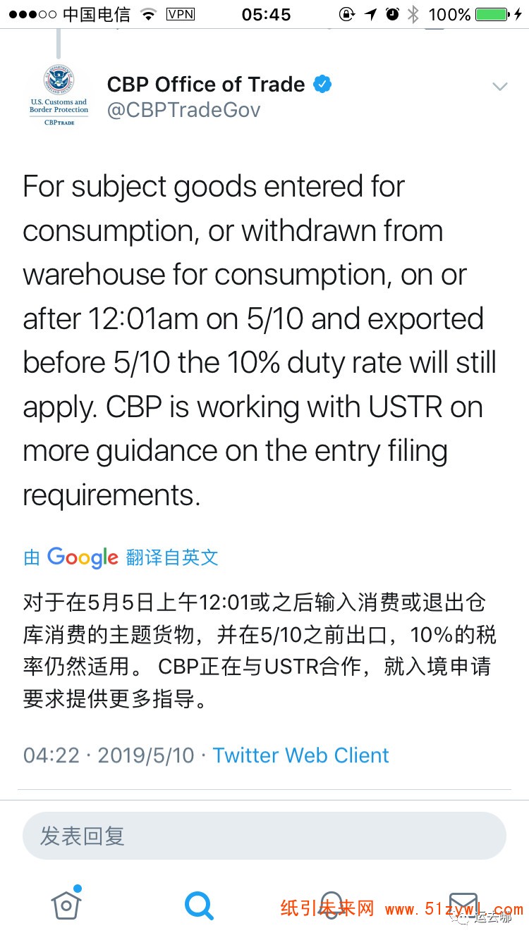 值得注意的是,根據CBP的說法,只要在5月10日前從中國出口了,即使貨物還未抵港,仍可按照10%稅率征收!對于這一點,建議各位外貿小伙伴盡快與美國收貨人盡快核實操作細節!