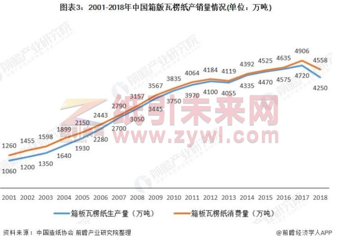 箱板紙和瓦楞紙是造紙及紙制品行業的主要產品,占總量近五成。根據中國造紙協會的統計數據,2018年,全國箱板紙、瓦楞原紙產量合計4250萬噸,消費量合計4558萬噸,存在缺口近308萬噸,近10年來,年均缺口達111萬噸。