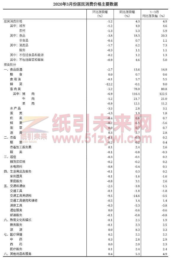 核心提示:紙引未來網訊 2020年3月,全國居民消費價格同比上漲4.3%。其中,城市上漲4.0%,農村上漲5.3%;食品價格上漲18.3%,非食品價格上漲0.7%;消費品價格上漲6.2%,服務價格上漲1.1%。一季度,全國居民消費價格比去年同期上漲4.9%。