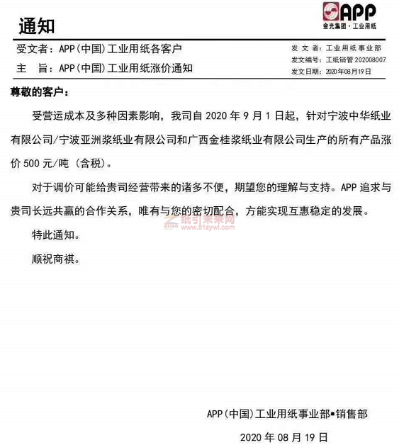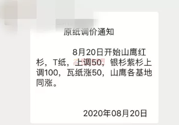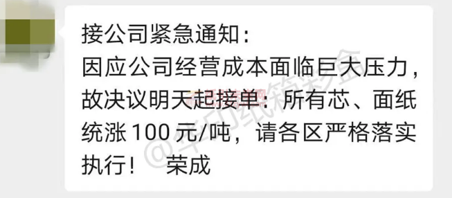 另一紙業巨頭榮成也宣布21日起漲價