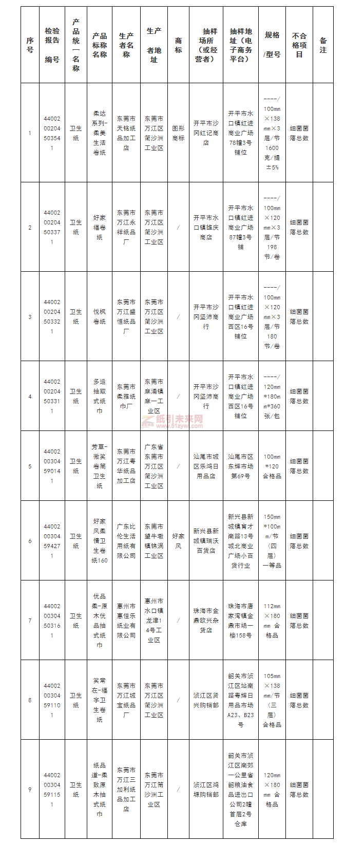 紙引未來網(wǎng)訊 2021年8月18日,廣東省市場監(jiān)督管理局網(wǎng)站發(fā)布2020年度廣東省集貿(mào)市場日用消費(fèi)品產(chǎn)品質(zhì)量監(jiān)督抽查情況。本次共對130家企業(yè)生產(chǎn)的247款衛(wèi)生用紙制品產(chǎn)品質(zhì)量開展了監(jiān)督抽查。經(jīng)檢驗(yàn),發(fā)現(xiàn)9家企業(yè)生產(chǎn)的9款產(chǎn)品不合格。