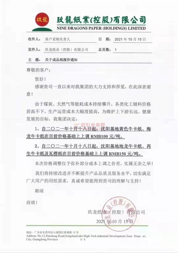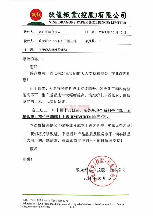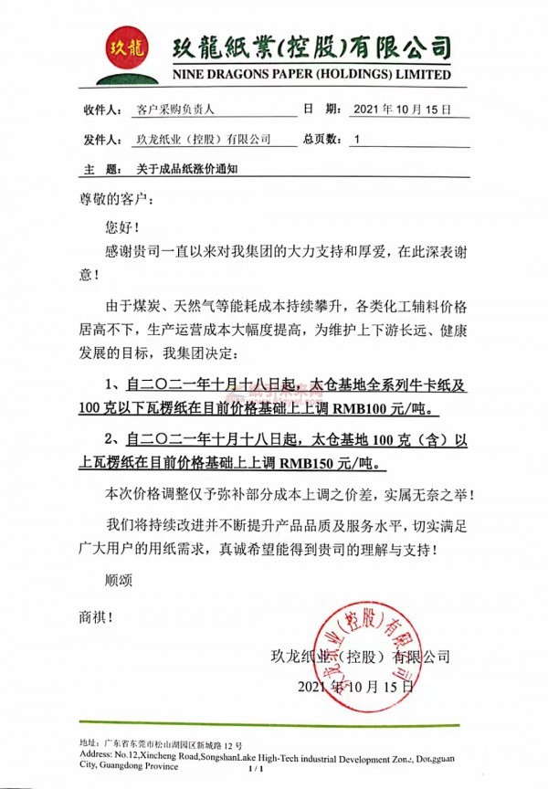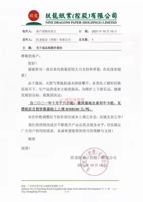 自國慶節之后,玖龍一周之內連發兩次漲價函