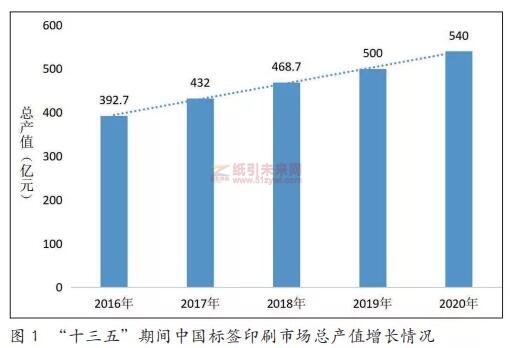 中國作為全球最大的標簽生產國和消費國,近五年來市場增長速度迅猛,從“十三五”初標簽印刷工業總產值392.7億元增長至2020年540億元(如圖1所示),年復合增長率達到8%~10%,預計到2021年末將增至600億元,是全球增速最快的標簽市場之一。