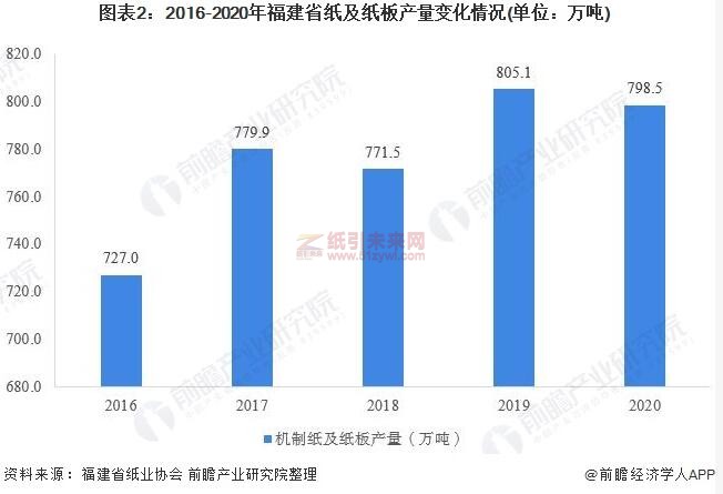 從產量規模來看,2016年以來,福建省紙及紙板產量呈現震蕩上行走勢,據福建省造紙協會統計數據顯示,2019年以來,福建省造紙行業主要產品產量達到805.1萬噸,創近年新高,到2020年,福建省全年生產紙及紙板產品798.5萬噸,同比下降0.82%。