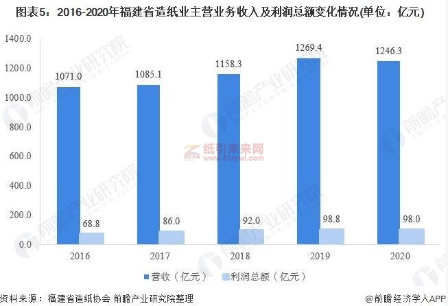 從行業經營效益來看,2017年以來,福建省造紙業主營收入及利潤總額呈現震蕩上行趨勢,2020年,受疫情影響,全省造紙業實現營收1246.3億元,同比下降1.8%;全年實現利潤總額98億元,同比下降0.8%。