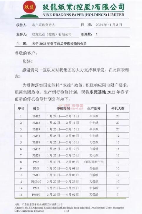紙引未來網訊 11月8日,玖龍紙業(控股)有限公司發布“關于2022年春節前后停機檢修的公函”,東莞基地將在2022年春節前后停機檢修,時間跨度從2022年1月22日到4月21日。單臺紙機的停機時長7-21天不等,整廠停機總時廠合計234天,產品涵蓋牛卡紙、瓦楞紙、白板紙、文化紙、白面/涂布牛卡紙。