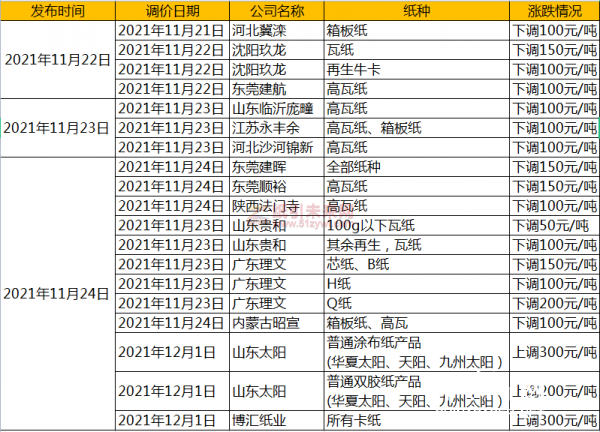 紙引未來網訊 本周卡紙主流紙廠宣布12月份提價來刺激終端備貨,促進經銷商加緊出貨,增加紙廠訂單,提振市場信息。瓦紙和箱板紙廠家由于近期進貨動力不足,成交減少,價格政策相對靈活,通常優惠50-100/噸為主。11月22日沈陽玖龍對瓦紙、再生牛卡紙發布降價100/噸通知,東莞建航對高瓦紙降價100/噸通知;11月23日龐疃、永豐余、錦新等紙企發布高瓦紙降價100/噸的通知;11月24日理文對芯紙和B紙發布降價150/噸、H紙降價100/噸、Q紙降價200/噸通知,山東太陽對普通涂布紙漲價300/噸和普通雙膠紙漲價200/噸通知,博匯對所有卡紙漲價300/噸通知。