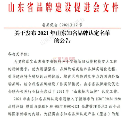 山東知名品牌的認定是為貫徹落實山東省委省政府關于實施新舊動能轉換重大工程的精神要求,助力質量強省、品牌戰略實施和品牌高端化進程,引導建設特色鮮明的品牌體系,培育具有較強競爭力的國內外高端品牌;是由山東省品牌建設促進會聯合相關行業協會根據《山東知名品牌認定管理辦法》的規定,經組織申報、資格審查、大數據信息挖掘、信息化系統平臺評審、專家評審、專家委員會審議、認定委員會認定等工作程序,推出山東知名品牌擬認定名單。