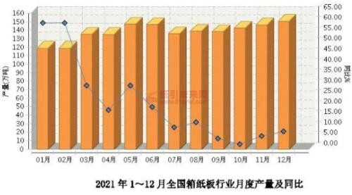 在箱紙板部分,2021年1-12月份,全國箱紙板累計完成產量1680.40萬噸,同比增長19.97%。