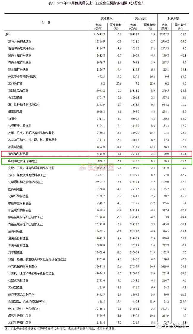 在41個工業大類行業中,13個行業利潤總額同比增長,1個行業持平,27個行業下降。其中,造紙和紙制品業實現利潤總額70.0億元,同比下降51.6%;印刷和記錄媒介復制業實現利潤總額78.3億元,同比下降15.6%。