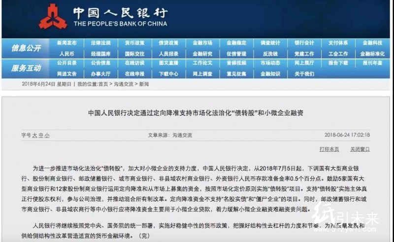 一是自2018年7月5日起,下調工行、農行、中行、建行、交行五家國有大型商業銀行和中信銀行、光大銀行等十二家股份制商業銀行人民幣存款準備金率0.5個百分點,可釋放資金約5000億元,用于支持市場化法治化“債轉股”項目,同時撬動相同規模的社會資金參與。相關銀行要建立臺賬,逐筆詳細記錄市場化法治化“債轉股”實施情況,按季報送人民銀行等相關部門。