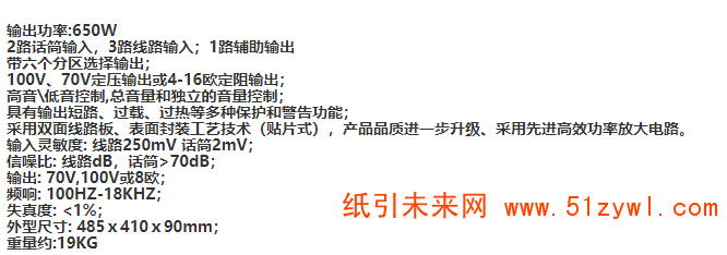 | 高強度結構機箱,與機架對稱結構,裝配快捷。大能量線性供電,高效率環型變壓器。獨立模塊結構,分辨率高,語音清晰細膩。平衡、不平衡輸入。立體聲、單聲道、橋接三種輸出方式。高靈敏度安全保護電路。電源、保護、信號、削波LED工作狀態指示。削峰限幅、電源軟啟動系統。用繼電器延時的電路機的軟啟動特性,從而保護了揚聲器免。雙Speaker和喇叭接線柱輸出。隧道式散熱結構,散熱效果更好,采用高效的智能風扇冷卻系統,在降低了整機噪音的同時又能保證機器長時間的穩定工作。高效率雙風扇冷卻通道。低噪音設計。輸入電壓:AC220V/50Hz。輸出阻抗:4-16Ω。機箱規格:2U。開關、指示:船型開關、面板電源,保護信號,諧波各種狀態,適合各種場合的聲音放大傳輸,對揚聲器有保護電路,電源軟啟動,搞保真,聲音清晰,人聲表現力強。 |