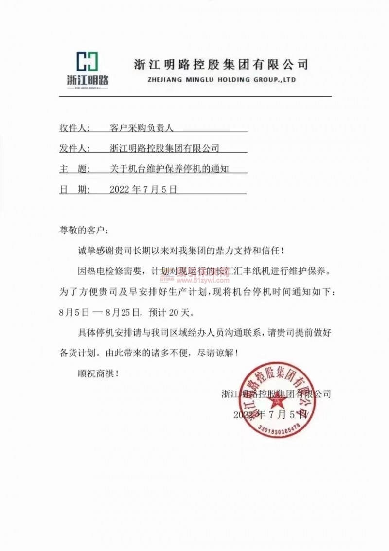 【停機(jī)函】2022年7月5日浙江明路控股集團(tuán)停機(jī)函