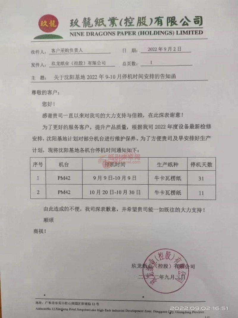 【停機函】2022年9-10月沈陽玖龍基地停機檢修計劃